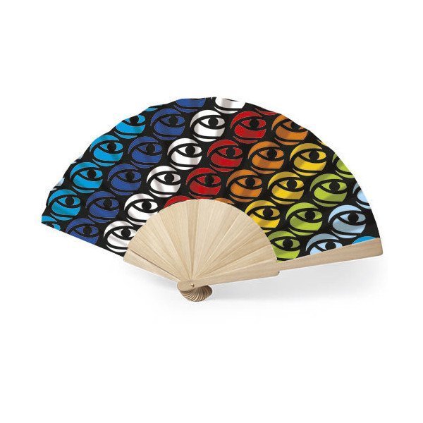 Abanico de madera y tejido de poliéster con estampado rainbow.Pedido mínimo: 50 udes.