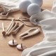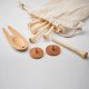 Set de accesorios de golf en bambú que incluyen 6 tees de golf, 1 herramienta de divot de golf y 2 marcadores de bolas de madera, todo ello presentado en una bolsa de algodón orgánico.