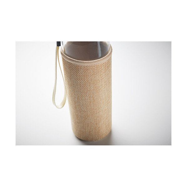 Botella de cristal con funda de neopreno y yute. Pedido mínimo: 50 udes.