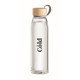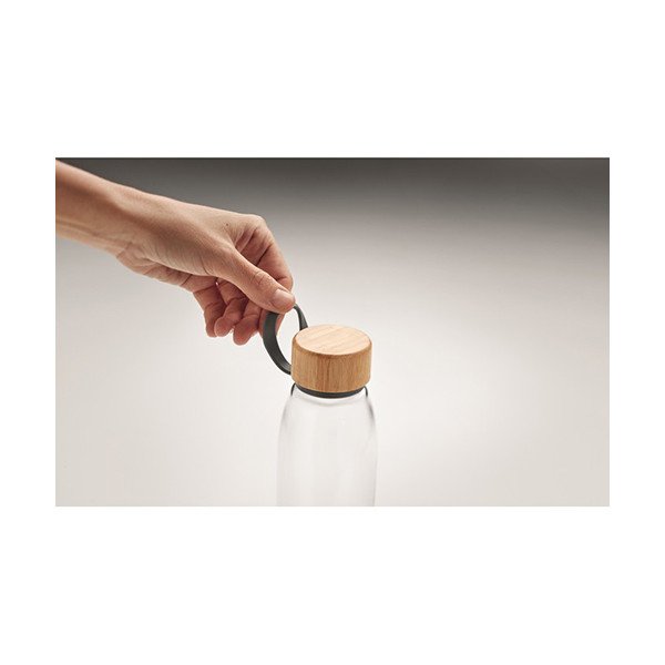 Botella de cristal con tapa de bambú con asa. Capacidad de 500 ml.Pedido mínimo: 50 udes.