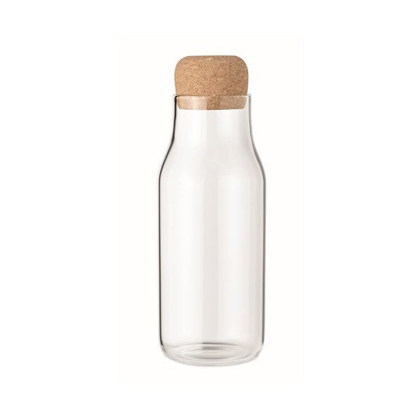 Botella de vidrio de borosilicato con tapa de corcho. Guarde sus zumos recién hechos, agua u otras bebidas en esta botella de vidrio.