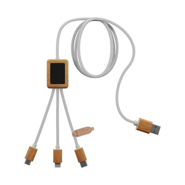 Cable de carga 3 en 1 de PET reciclado con logotipo retroiluminado y estuche cuadrado de bambú SCX.design C39. Pedido mínimo: 25 udes.