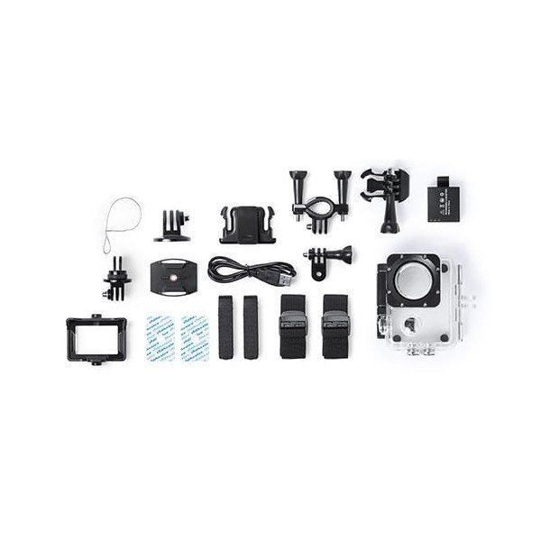 Incluye carcasa sumergible hasta 30m de profundidad y multitud de accesorios para ajuste en casco, manillar o cinturón, así como correas ajustables para cabeza y torso o un adaptador giratorio de 360º.