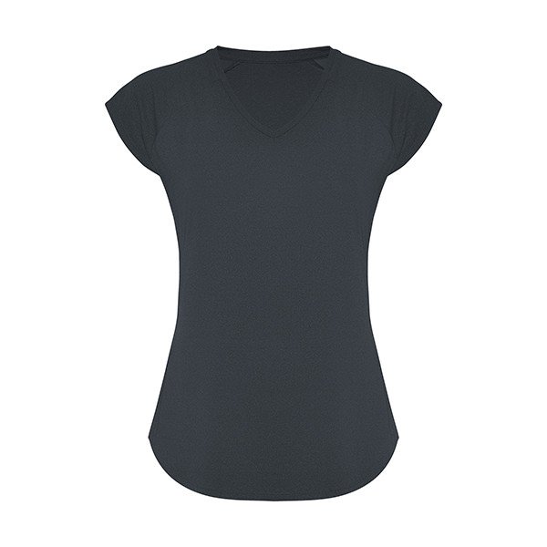 Camiseta multideporte de mujer manga corta estilo manga ranglan. Cuello pico. Tejido poliéster con tacto algodón. Corte entallado.