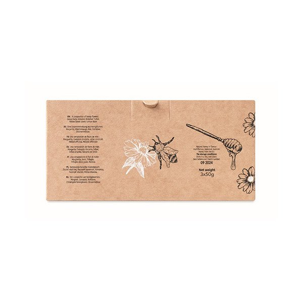 Miel de flores silvestres, de lavanda y semillas de colza (50 grs. cada una). Se presenta en una caja de papel kraft.
