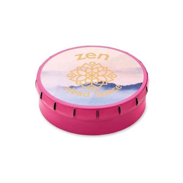 Bote de lata con 28 gramos de caramelos de menta.Pedido mínimo: 100 udes.