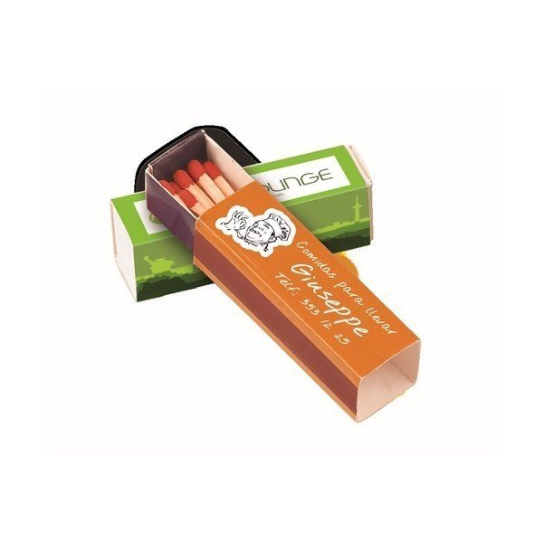 Caja de 21 fósforos de 47 mm. de largo, con diferentes colores de cabezal, impresión a todo color incluida.