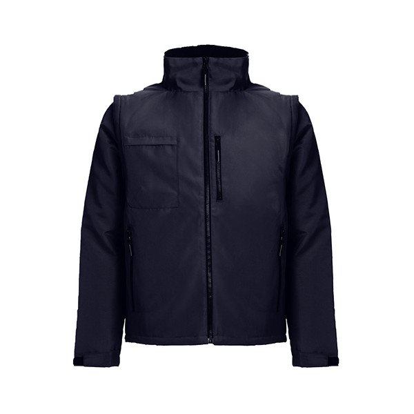 Chaqueta de trabajo unisex, acolchada. Convertible en chaleco, con mangas amovibles mediante cremallera. Cuello forrado con tejido polar. 3 bolsillos con cremallera. Acceso con cremallera en la parte posterior para facilitar la personalización.