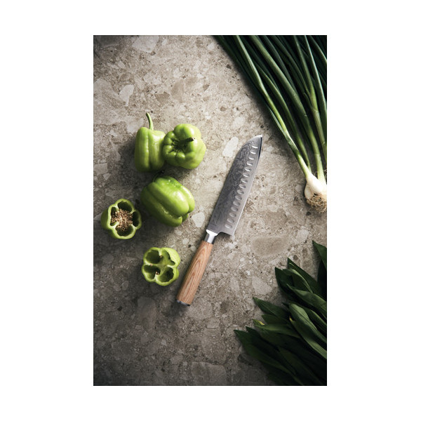 Este cuchillo Santoku es ideal para cortar carne y verduras más grandes o picar hierbas.