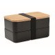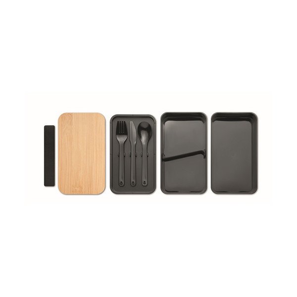 Fiambrera de PP con dos compartimentos con tapa de bambú que incluye 1 separador de PP extraíble y 3 cubiertos con banda de poliéster.