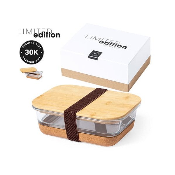 Fiambrera de cristal de 730 ml., tapa hermética en bambú y base en corcho. Pedido mínimo: 25 udes.