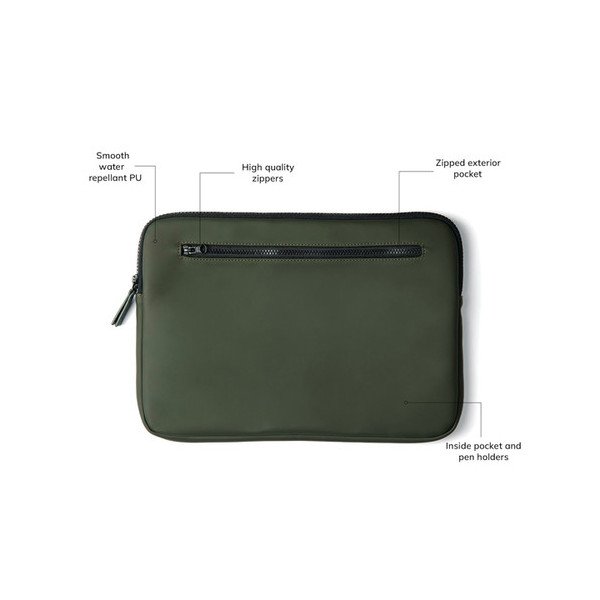 Confeccionado en tejido PU nobuk ligero y repelente al agua con un elegante exterior mate e interior en tejido sintético ligero. Adecuado para ordenadores con un tamaño de 14 pulgadas. Ten en cuenta que las dimensiones de la pantalla no son las mismas que las dimensiones de todo el ordenador.