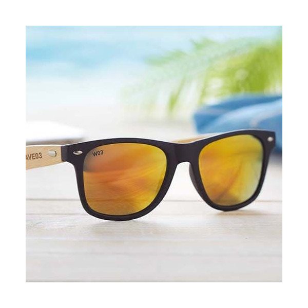 Gafas de sol con patillas de bambú y lentes efecto espejo.Pedido mínimo: 50 udes.