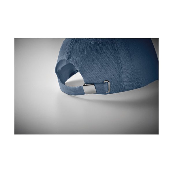 Gorra de béisbol de 5 paneles confeccionada en tejido de cáñamo 100% con cierre ajustable con hebilla metálica.