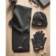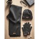 Set de gorro y guantes en material acrílico elástico con parche de polipiel.Pedido mínimo: 50 udes.