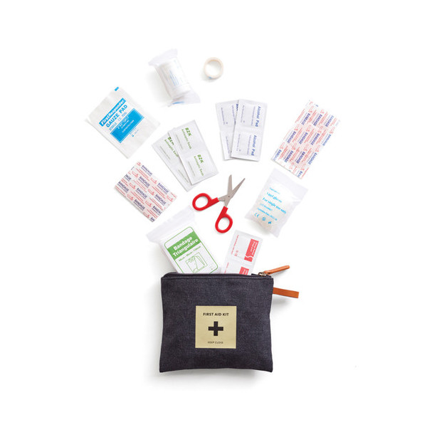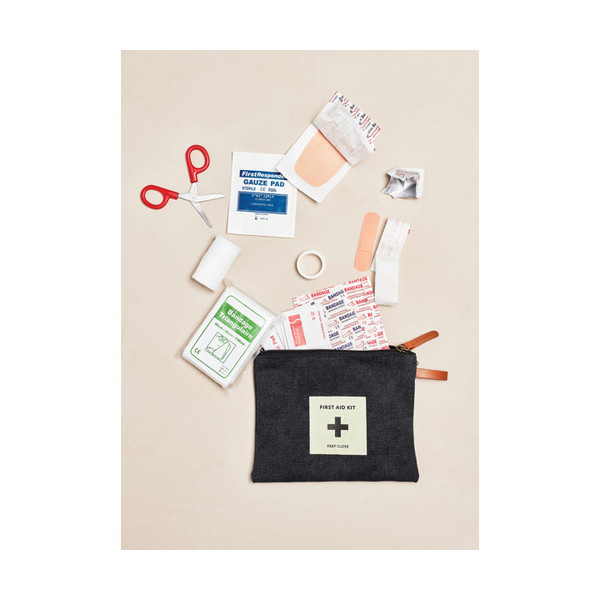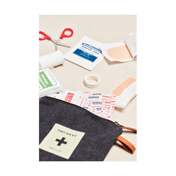 La bolsa de tela con cremallera contiene todo lo necesario en caso de pequeños accidentes como tiritas, tijeras, vendas, etc. Se presenta en una bolsa de plástico.