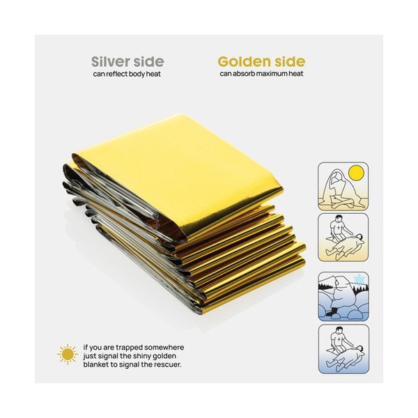 Contiene una resistente película de PET Mylar, plateada por una cara y dorada por la otra, con un grosor de 12μm para una óptima retención del calor y resistencia a la intemperie.