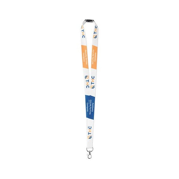 El lanyard de 90 cms. se imprime con una sublimación a todo color para todos los diseños únicos e imágenes fotográficas. El lanyard de satén blanco puede sublimarse sólo por una cara, ya que el diseño del logotipo es ligeramente visible también por la otra.