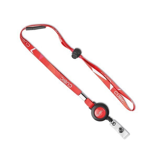 Lanyard ajustable fabricado en poliéster fino con mosquetón extensible para credenciales con doming a todo color.