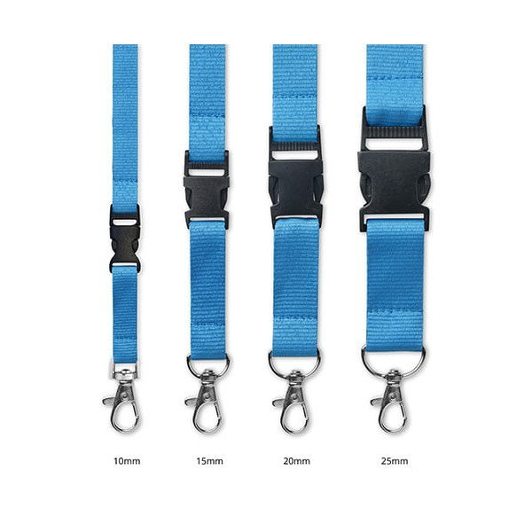 Lanyard en resistente poliéster con hebilla multifunción y gancho metálico.Pedido mínimo: 100 udes.