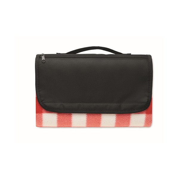 Manta de picnic de RPET 150 gr/m² plegable, de forro polar con reverso de PEVA recubierto resistente al agua. Incluye un bolsillo frontal con cremallera y una cinta bandolera corta.