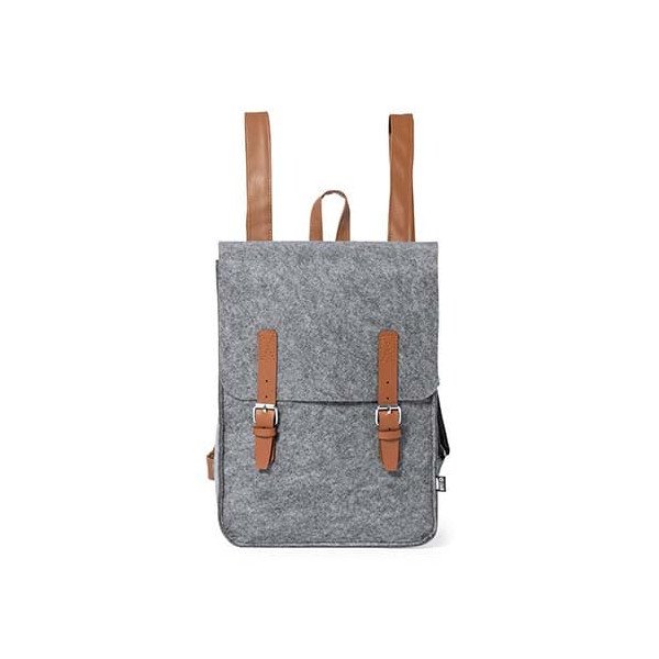 Mochila de diseño fabricada en resistente fieltro RPET, con tiras de cierre, asa de transporte y cintas para hombros en polipiel.
