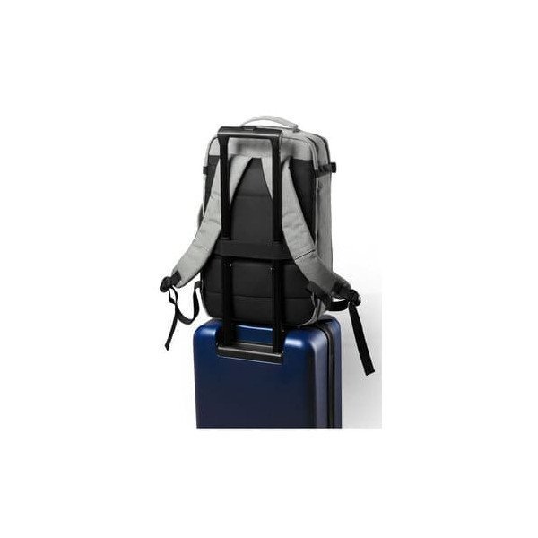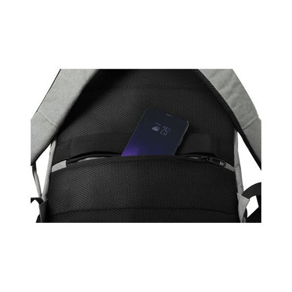 En diseño urbano, con bolsillo antirrobo, incluye conexión USB para carga de dispositivos móviles (cable incluido, batería auxiliar no incluida) y bolsillo acolchado para portátil de hasta 17 pulgadas.