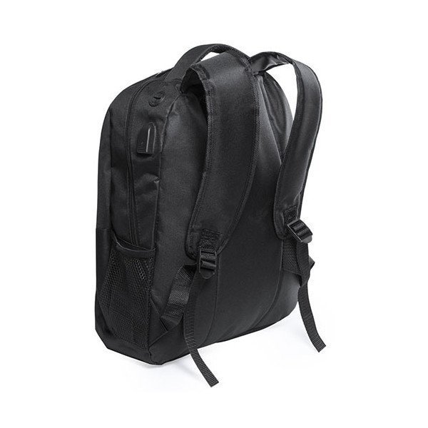 Mochila de resistente poliéster 600D en elegante acabado impermeable de color negro y salida para auriculares. Con compartimento interior con salida USB para conexión de powerbank -no incluido-. Interior con compartimento acolchado para ordenador portátil de hasta 15 pulgadas y tablets de hasta 10 pulgadas. Multitud de bolsillos interiores y exteriores. Cintas de hombros y espalda con acolchado ergonómico