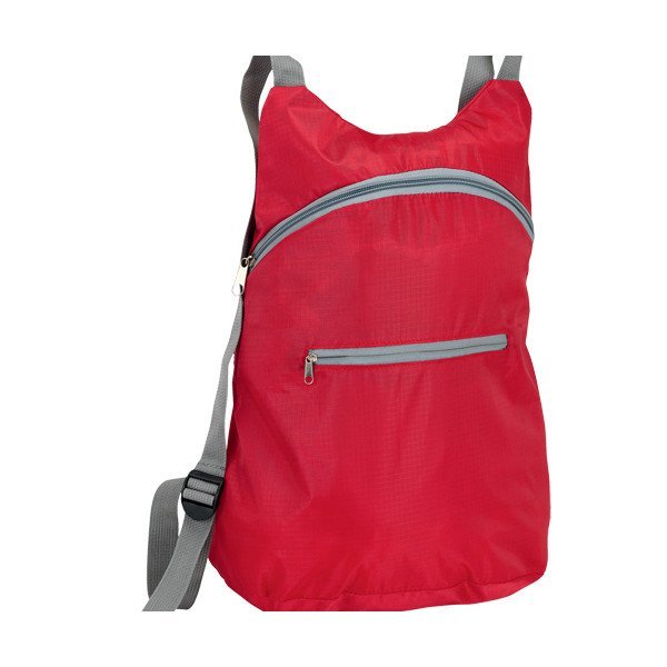 Mochila plegable en suave poliéster 190D de alegres colores, con cierre de cremallera y bolsillo frontal.