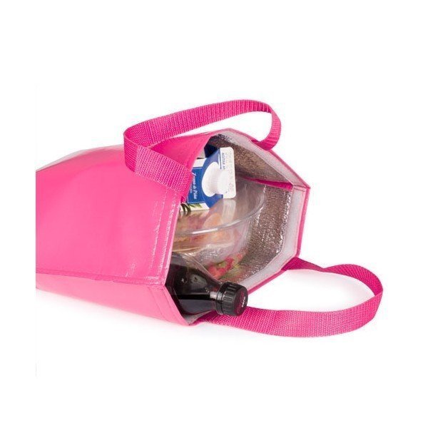 Bolsa nevera en resistente non-woven de acabado laminado brillante y cierre de velcro. Con cómodas asas de transporte en nylon a juego e interior isotermo en acabado de aluminio. Resistencia hasta 7 kgs. de peso.