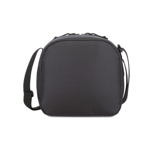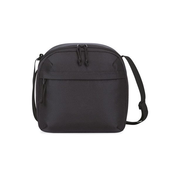 Bolsillo frontal con cremallera para guardar accesorios. Abertura en ángulo con doble cremallera hacia el compartimento principal aislado. Correa de hombro ajustable y ambidiestra para un uso personalizado. Capacidad para 9 latas.