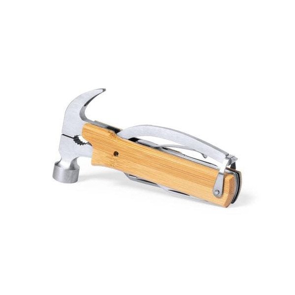Con 13 funciones, entre otras martillo y sacaclavos; cuchillo y cortauñas; destornillador plano y philips; lima; abridor y alicates. Cordón a juego en polipiel y presentada en caja individual de diseño kraft.