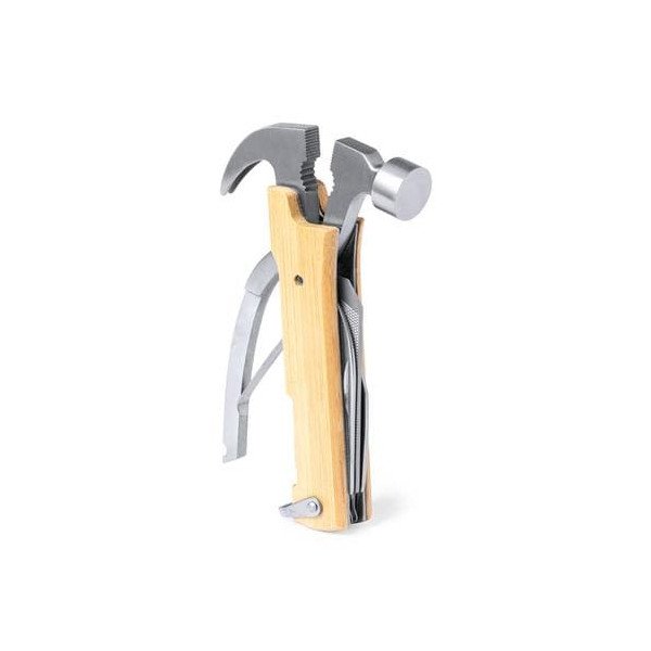 Multiherramienta de acero inox y empuñadura de bambú. Pedido mínimo: 50 udes.