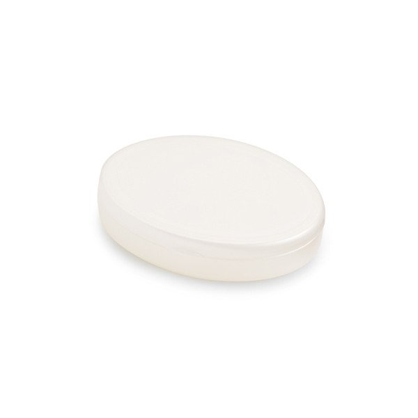 Pastillero en PP de forma ovalada con 3 divisiones. Dentro de la tapa hay iconos/figuras que identifican las principales comidas para facilitar la organización diaria.