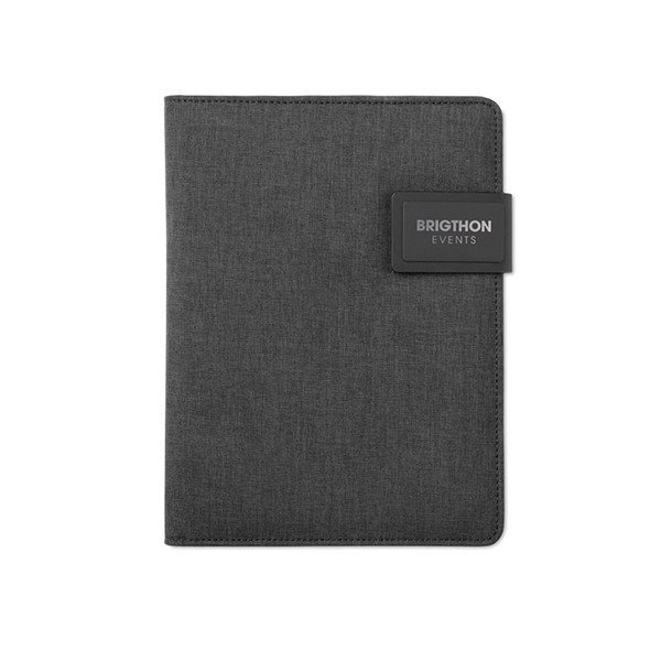 Portafolios A5 en PU de cierre magnético con power bank. Pedido mínimo: 25 udes.