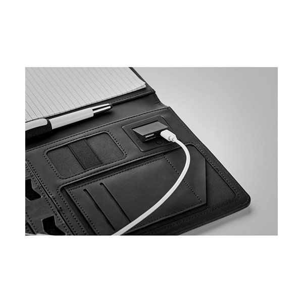 Portafolios A5 en PU de cierre magnético con power bank 4.000 mAh. Con conexión de micro USB a Tipo C y soporte plegable para tablets. Incluye 20 hojas y múltiples compartimentos.