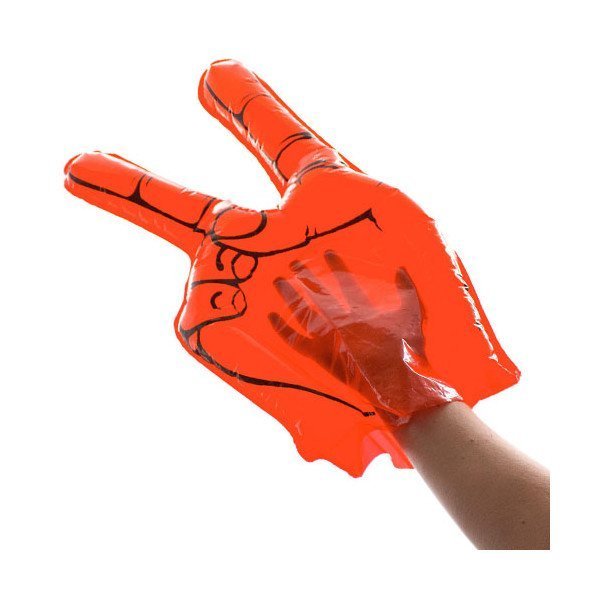 Divertida mano de animación victoria en resistente material LDPE de vivos colores. Reutilizable y con válvula de inflado incluida.