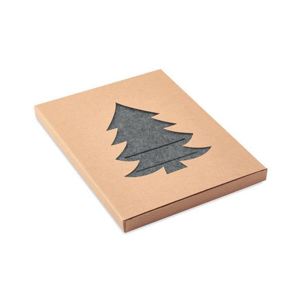 Juego de 4 portacubiertos de fieltro RPET en forma de árbol de Navidad presentados en caja kraft. Pedido mínimo: 100 udes.