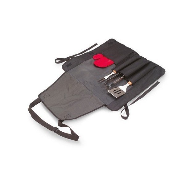 Delantal con 3 utensilios de barbacoa y un guante. Pedido mínimo: 25 udes.
