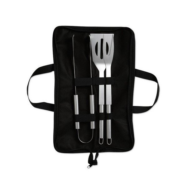 Set de 3 herramientas para barbacoa en acero inoxidable con funda de non woven con cremallera. Incluye pinzas, espátula y tenedor para barbacoa.