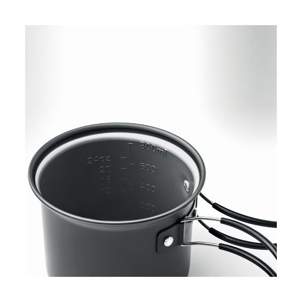 Contenido: 1 olla de aluminio acabado gris mate. 800 ml. de capacidad; 13 cms. de diámetro x 10 cms. de alto. Asas plegables con protección antiquemaduras. 1 olla de aluminio acabado gris mate. 600 ml. de capacidad; 12 cms. de diámetro x 6,5 cms. de alto. Asas plegables con protección antiquemaduras. Cuchara, cuchillo y tenedor plegables fabricados en acero inox. Con mango troquelado y cierres de seguridad.