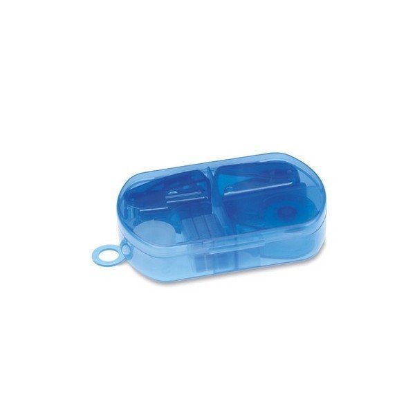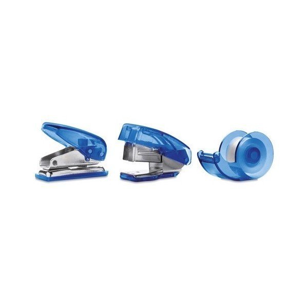 Incluye dispensador de cinta adhesiva, mini grapadora, 300 grapas, perforador de 1 agujero y cinta adhesiva de recambio. Todo presentado en caja compacta de plástico translúcido.