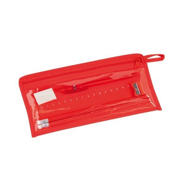 Set de 7 piezas en estuche con cuerpo en non-woven de vivos colores y ventana transparente frontal de PVC. Incluye 2 lápices de madera con cuerpo cilíndrico, 1 Bolígrafo, 1 regla, 1 goma, 1 sacapuntas.
