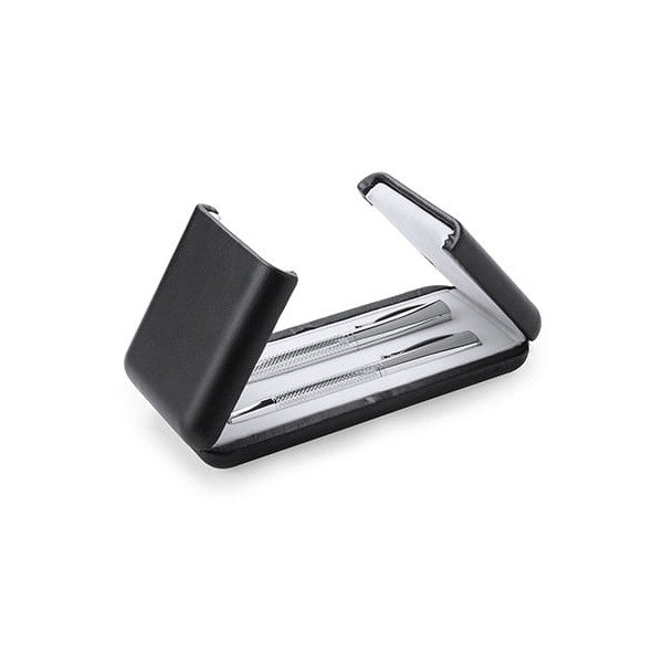 De cuerpo metálico antideslizante en acabado plateado brillante con clip a juego. Presentado en elegante y original estuche individual de polipiel en color negro con interior troquelado en suave antelina blanca.