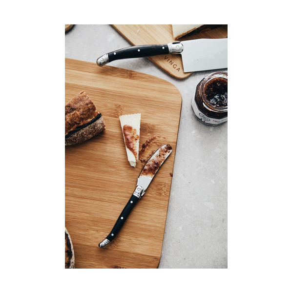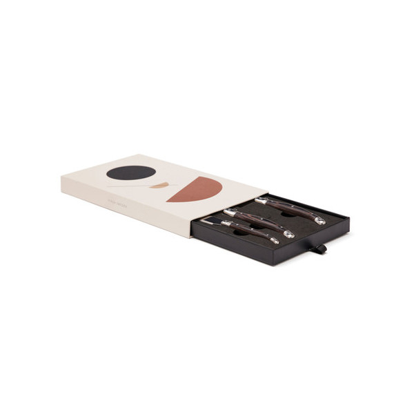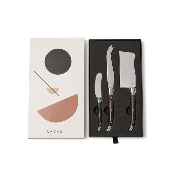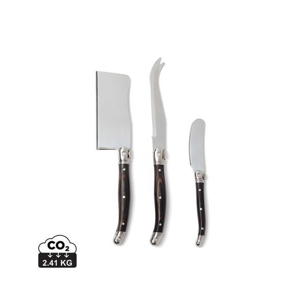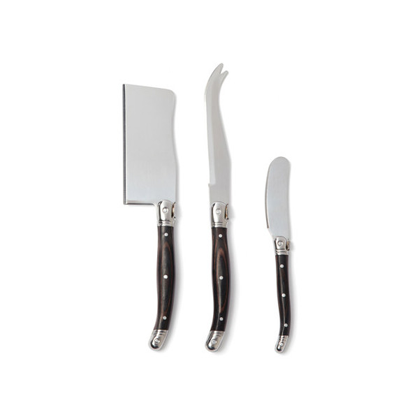 Un exclusivo juego de cuchillos para queso de acero inoxidable que consta de dos cuchillos para queso y un cuchillo para mantequilla con mango de madera pakka negra.