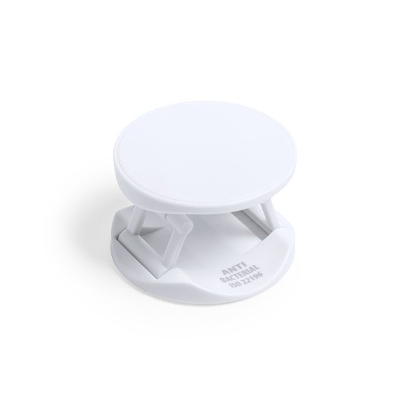 Soporte antibacteriano para smartphone. Diseño plegable en elegante acabado de color blanco, especialmente diseñado para marcaje en tampografía. Con adhesivo 3M, de fijación extra fuerte y libre de residuos al despegarlo del dispositivo.