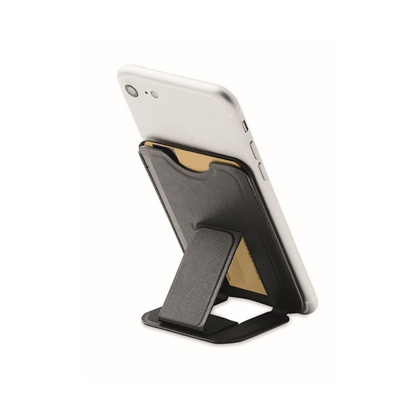 Portatarjetas de crédito en PU con cierre magnético y funcionalidad de soporte para el teléfono con cinta 3M en el reverso.