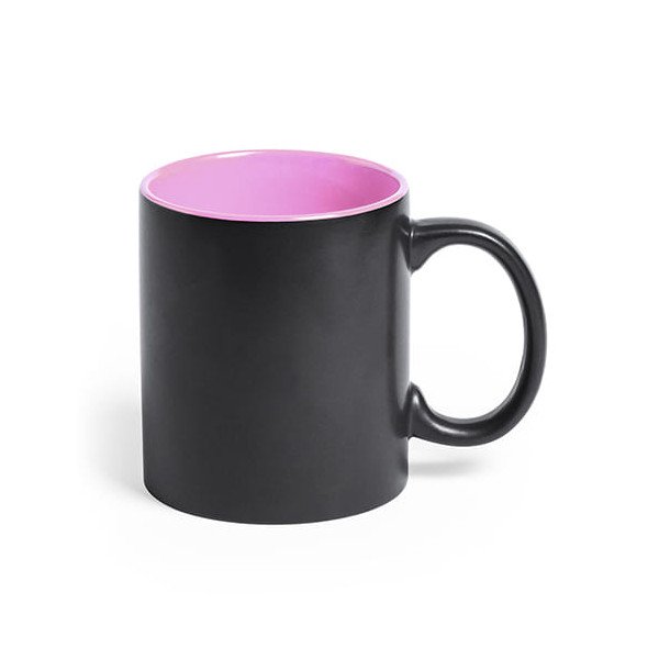 Parte exterior en color negro, especialmente diseñada para marcaje en láser, e interior en variada gama de vivos colores. Al grabar el logotipo en la parte exterior, se muestra el color del interior de la taza.