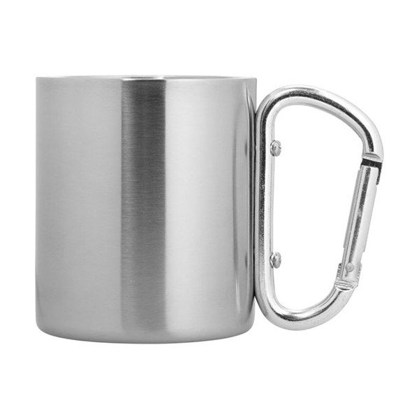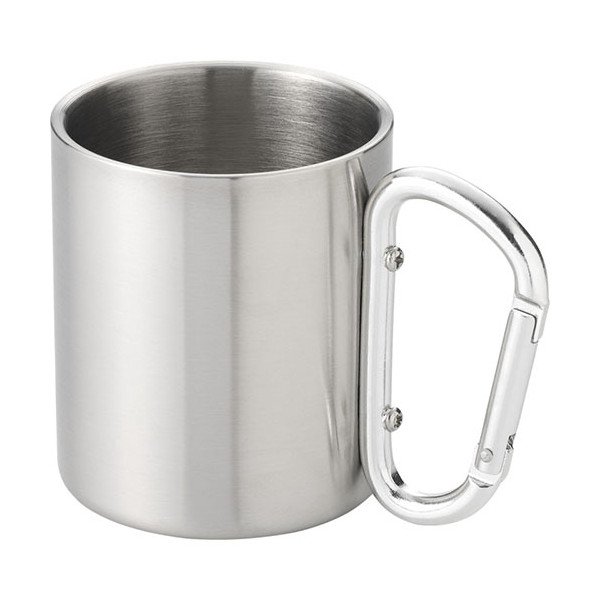 Taza isotérmica con mosquetón Alps. Una taza de 200 ml con asa ancha construida en acero inoxidable y con función de mosquetón en el asa. Ideal para camping o escapadas al aire libre.
