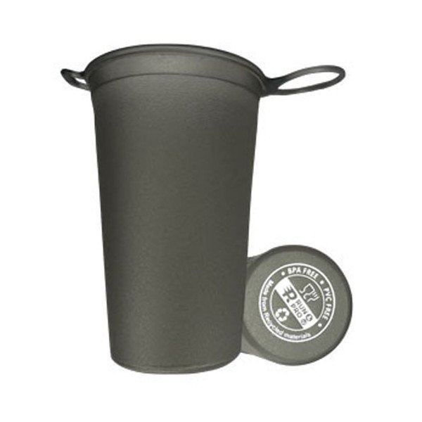 Vaso plegable fabricado en resistente TPU, con diseño kugero de 200 ml, fabricado con materiales reciclados, con refuerzo en la parte superior, una anilla y soporte para mayor sujección, disponible en color azul y gris.